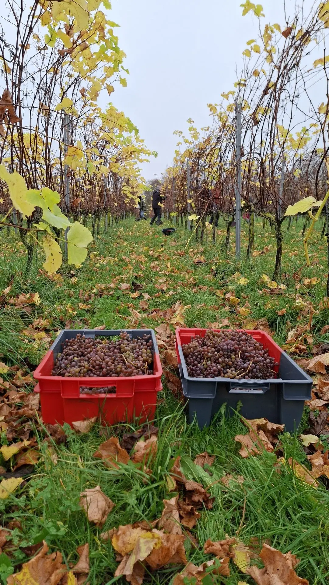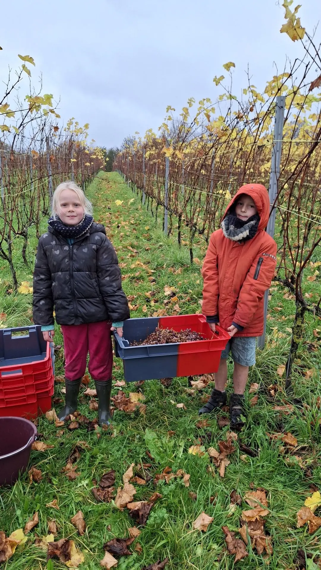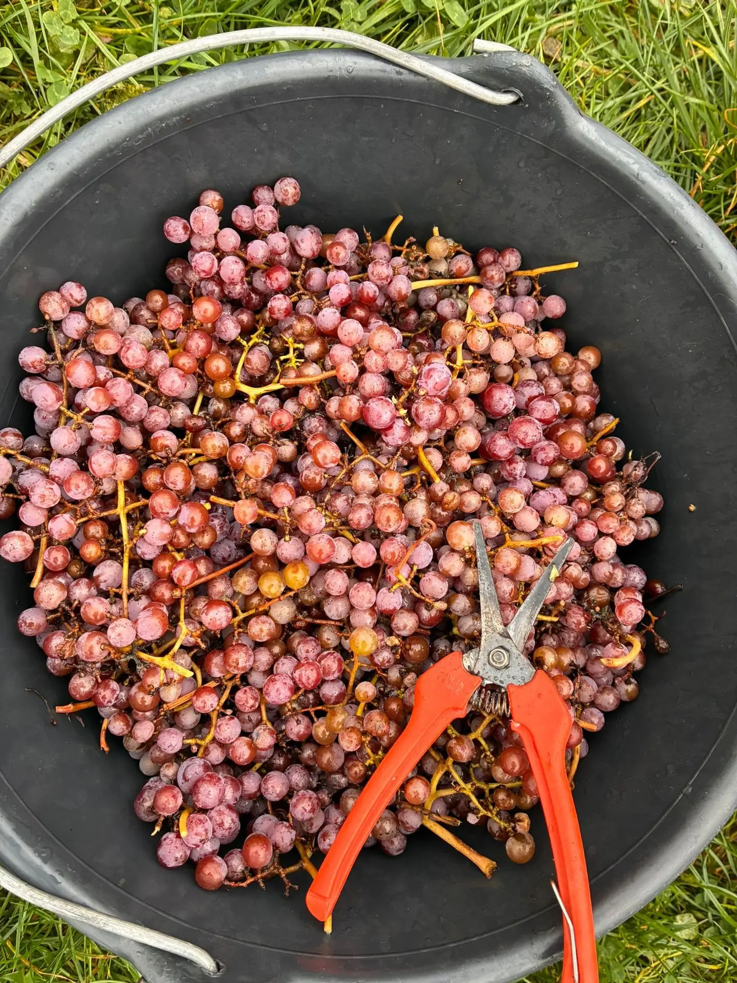 Rien ne se perd, on a récolté les quelques grapillons laissés dans les rangs pour en faire du jus qui fera la plus grande joie des petits (et de certains grands) lors de prochains apéros!